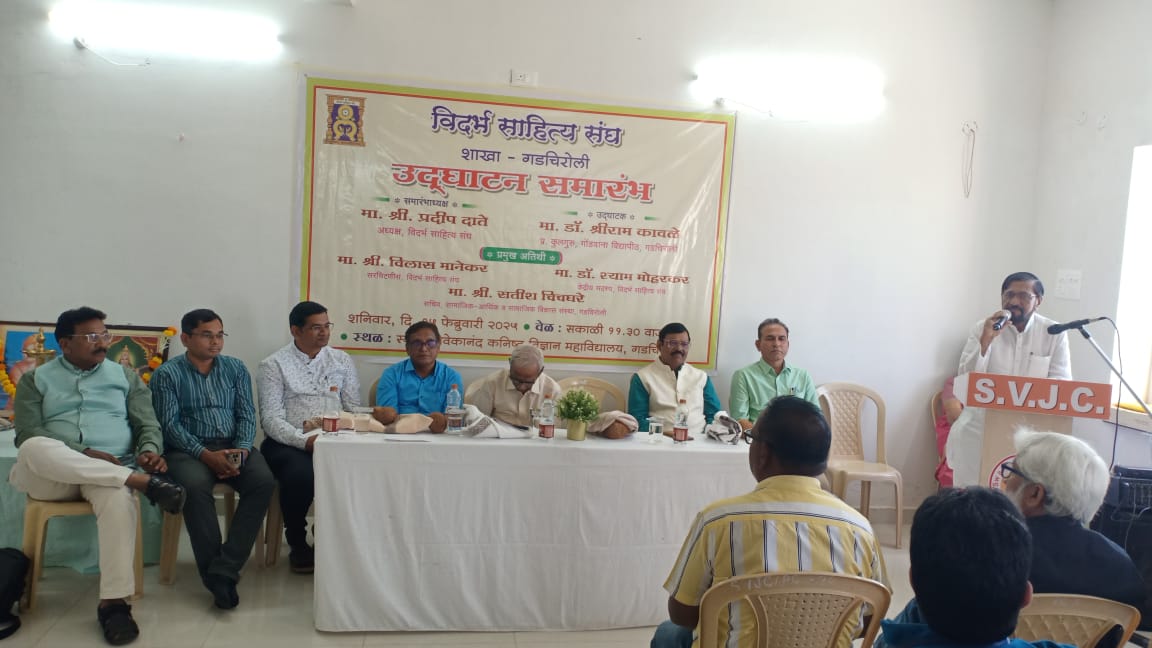 स्थानिक स्वामी विवेकानंद कनिष्ठ महाविद्यालयात शनिवार (ता. १५) विदर्भ साहित्य संघाच्या गडचिरोली जिल्हा कार्यकारिणीचे उद्घाटन करण्यात आले. यावेळी अध्यक्षस्थानाहून मार्गदर्शन करताना ते बोलत होते. कार्यक्रमाचे उद्घाटन विदर्भ साहित्य संघाचे केंद्रीय सदस्य डाॅ. श्याम मोहरकर यांच्या हस्ते करण्यात आले. प्रमुख पाहुणे म्हणून विदर्भ साहित्य संघाचे सरचिटणीस विलास मानेकर, साहित्यिक श्याम माधव धोंड, इंद्रजित ओरके, तीर्थराज कापगते, आर्थिक व सामाजिक विकास संस्थेचे सचिव सतीश चिचघरे, गडचिरोली जिल्हा शाखेचे अध्यक्ष प्रा. डाॅ. नरेंद्र आरेकर, रामचंद्र वासेकर, सचिव रामचंद्र वासेकर आदींची प्रमुख उपस्थिती होती. पुढे मार्गदर्शन करताना विदर्भ साहित्य संघाचे अध्यक्ष प्रदीप दाते म्हणाले की, विदर्भ साहित्य संघ ही साहित्य क्षेत्रातील अतिशय अनुभवी आणि नामांकितसंस्था आहे. विदर्भ साहित्य संघाच्या माध्यमातून अनेक साहित्यिक पुढे आले आणि त्यांनी साहित्यसेवा करत रसिकांना आनंद दिला. गडचिरोली जिल्ह्यात संस्थेची कार्यकारिणी असावी. त्या माध्यमातून या जिल्ह्यातील साहित्यिकांना प्रेरणा, सहकार्य व येथील साहित्य चळवळीला बळ मिळावे, अशी अनेक वर्षांची इच्छा होती. ती इच्छा आज पूर्ण झाली आहे. या जिल्हा कार्यकारिणीतील पदाधिकारी, सदस्य तडफदार, उत्साही असल्याने हा जिल्हा साहित्यविश्वात ठळकपणे दिसेल, असेही ते म्हणाले. कार्यक्रमाचे उद्घाटक तथा विदर्भ साहित्य संघाचे केंद्रीय सदस्य डाॅ. श्याम मोहरकर यांनी विदर्भ साहित्य संघाच्या वाटचालीची माहिती देताना विदर्भातील साहित्य चळवळीत असलेल्या योगदानाची माहिती दिली. साहित्यिक श्याम माधव धोंड यांनी अनेक कवींच्या कविता सादर करत बहारदार भाषण करताना येथील साहित्यिक नावारूपास नक्कीच येतील, असे सांगितले. तसेच सकस वाचन करण्याचे आवाहनही त्यांनी केले. गडचिरोली जिल्हा कार्यकारिणीचे अध्यक्ष प्रा. डाॅ. नरेंद्र आरेकर यांनी आपल्या प्रास्ताविकातून विदर्भ साहित्य संघाची शाखा गडचिरोली जिल्ह्यात स्थापन झाल्याने येथील साहित्यविश्वात उत्साह निर्माण झाल्याचे सांगत ज्येष्ठांच्या मार्गदर्शनात ही कार्यकारिणी उत्तम कार्य करेल, असे सांगितले. जिल्हा कार्यकारिणीचे उपाध्यक्ष प्रमोद बोरसरे यांनी आपल्या मनोगतातून विदर्भ साहित्य संघाने तळागाळातील कवी, लेखकांना दिलेल्या मदतीच्या हातांचा आवर्जून उल्लेख केला. यावेळी इतर मान्यवरांनीही समयोचित विचार व्यक्त केले. प्रास्ताविक प्रा. डाॅ. नरेंद्र आरेकर, संचालन गौरी तळवलकर यांनी केले, तर आभार रामचंद्र वासेकर यांनी मानले.