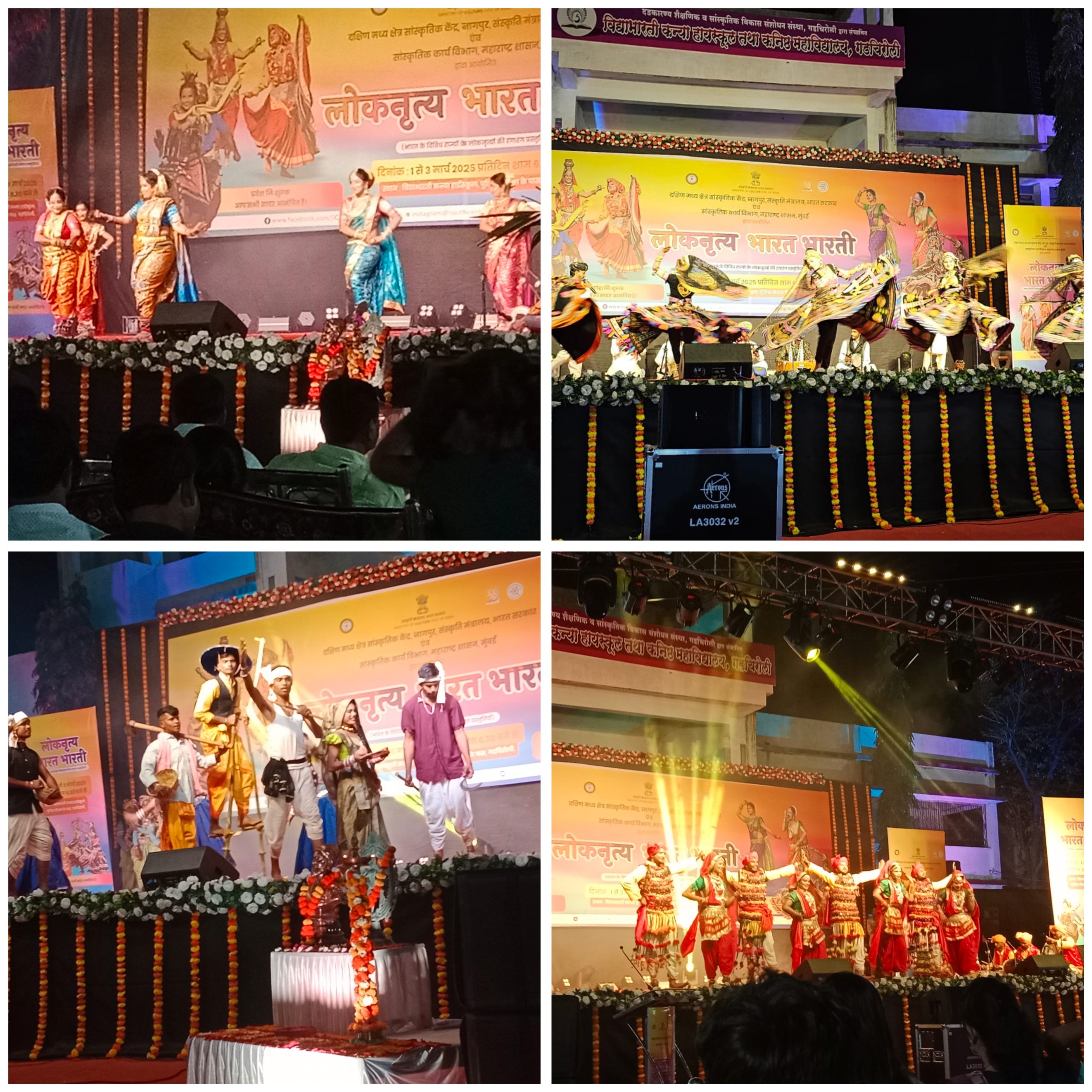 गडचिरोली, ता. १ : दक्षिण मध्य क्षेत्र सांस्कृतिक केंद्र, नागपूर, संस्कृति मंत्रालय, भारत सरकार आणि सांस्कृतिक कार्य विभाग, महाराष्ट्र शासन, मुंबई यांच्या संयुक्त विद्यमाने दिनांक १ ते ३ मार्च २०२५ दरम्यान दररोज सायं. ६.३० वाजता “लोक नृत्य भारत भारती” या महोत्सवाचे आयोजन विद्याभारती कन्या हायस्कूल, गडचिरोली येथे करण्यात आले आहे. या महोत्सवाचे उद्घाटन शनिवारी विद्याभारती कन्या हायस्कूल आणि कनिष्ठ महाविद्यालय, गडचिरोलीचे संस्थापक श्री. राजाभाऊ मुनघाटे, गडचिरोलीचे माजी आमदार नामदेव उसेंडी, समाज कल्याण विभागाचे सहाय्यक आयुक्त श्री. सचिन मडावी यांच्या हस्ते दीपप्रज्वलन करून करण्यात आले. यावेळी दक्षिण मध्य क्षेत्र सांस्कृतिक केंद्र, नागपूरचे सहायक संचालक (कार्यक्रम) श्री. दीपक कुलकर्णी आणि सांस्कृतिक कार्य संचालनालय, महाराष्ट्र शासन, मुंबई, नागपूर विभागाचे सहायक संचालक श्री. संदीप शेंडे उपस्थित होते.