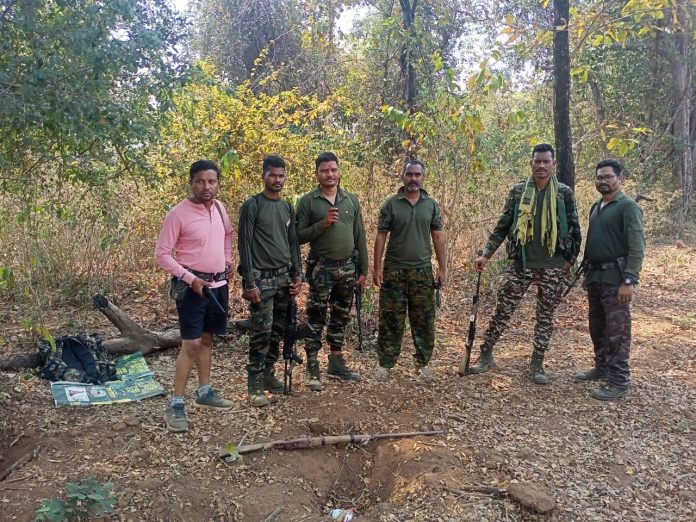शनिवार (ता. १५) भामरागड उपविभागआअंतर्गत नव्याने स्थापन करण्यात आलेल्या कवंडे पोलिस स्टेशन येथे तैनात असलेल्या विशेष अभियान पथकाच्या जवानांना अभियानादरम्यान पोलिस स्टेशनपासून दक्षिणेला अंदाजे १०० मीटर अंतरावर असलेल्या पायवाटेवर झुडपांमध्ये लपवून ठेवलेली भरमार बंदूक आढळून आली होती. याबाबत वरिष्ठांना माहिती दिली असता वरिष्ठांच्या मार्गदर्शनात बीडीडीएस पथकाला घटनास्थळी पाचारण करण्यात येऊन बीडीडीएस पथकातील विविध अत्याधुनिक उपकरणांद्वारे या जंगल परिसरात शोध अभियान सुरू करण्यात आले. यावेळी भरमार बंदूक लपविलेल्या झुडपांशेजारी एक संशयित जागा दिसल्याने या घटनास्थळाची पाहणी केली असता जमिनीमध्ये अंदाजे दीड ते दोन फुट खोलावर डेटोनेटरसाठी वापरण्यात येणाया लाल रंगाच्या वायरने बांधलेली प्लास्टीकची पिशवी आढळली. या पिशवीची बीडीडीएस पथकाकडून एक्सप्लोझीव्ह किटने तपासणी केली असता त्यामध्ये स्फोटक पदार्थ असल्याची खात्री झाल्याने वरिष्ठांच्या मार्गदर्शनात स्फोटक पदार्थ घटनास्थळावरच नष्ट करण्यात आले. तसेच प्रकरणी गुन्हा दाखल करण्याची प्रक्रिया सुरू आहे. ही कारवाई पोलिस अधीक्षक नीलोत्पल, अपर पोलिस अधीक्षक (अभियान) यतीश देशमुख, अपर पोलिस अधीक्षक (प्रशासन) एम. रमेश, अपर पोलिस अधीक्षक अहेरी सत्यसाई कार्तिक तसेच भामरागडचे उपविभागीय पोलिस अधिकारी अमर मोहिते यांच्या मार्गदर्शनात कवंडे पोलिस स्टेशनचे प्रभारी अधिकारी पोलिस उपनिरीक्षक मंदार शिंदे, विशेष अभियान पथक व बीडीडीएस पथकाच्या जवानांनी पार पाडली. पोलिस अधीक्षक नीलोत्पल यांनी या कार्यवाहीत सहभागी जवानांचे कौतुक केले आहे. तसेच या जंगल परिसरात माओवादविरोधी अभियान आणखी तीव्र करण्याचे संकेत दिले असून, माओवाद्यांनी माओवादाची हिंसक वाट सोडून आत्मसमर्पण करून सन्मानाने जीवन जगण्याचे आवाहन केले आहे.
