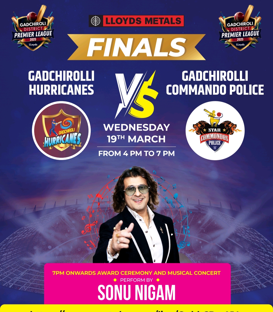 गडचिरोली, ता. १८ : गडचिरोली जिल्हा प्रीमियर लीगचा एका रोमांचकारी अंतिम सामन्यात समारोप होत असताना गडचिरोली जिल्हा क्रीडा आणि मनोरंजनाच्या अभूतपूर्व संध्याकाळसाठी सज्ज झाला आहे. महाअंतिम सामन्यातील पुरस्कार समारंभ आणि दिग्गज गायक सोनू निगमच्या ऐतिहासिक संगीत मैफलीला २०,००० पेक्षा अधिक लोकांची गर्दी अपेक्षित आहे. हा कार्यक्रम 1१९ मार्च २०२५ रोजी MIDC मैदान, गडचिरोली येथे होणार आहे.