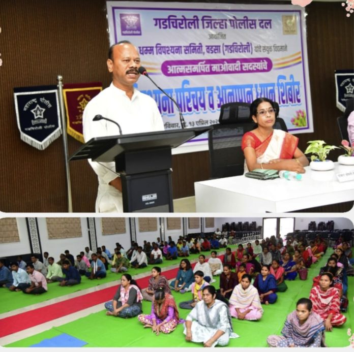 गडचिरोली, ता. १३ : शासनाच्या आत्मसमर्पण योजनेमुळे, हिंसाचाराच्या जीवनाला कंटाळून तसेच अनेक आत्मसमर्पित माओवाद्यांचे पोलिस दलाने पुनर्वसन घडवून आणल्यामुळे अनेक जहाल माओवाद्यांनी आजपर्यंत पोलिसांसमोर आत्मसमर्पण केले आहे. अशा १०२ आत्मसमर्पित माओवाद्यांसाठी एक दिवसीय विपस्सना ध्यान साधना शिबिर रविवार १३ एप्रिल रोजी आयोजित करण्यात आले.