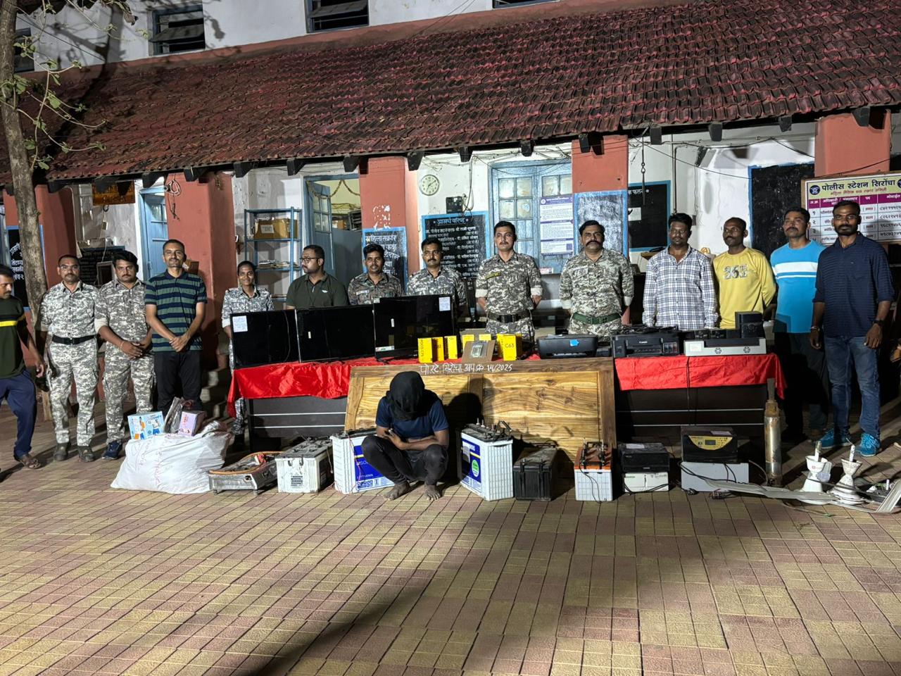 प्रभारी पोलिस अधीक्षक यतीश देशमुख यांच्या मार्गदर्शनात प्रभारी अधिकारी तथा पोलिस निरीक्षक समाधान चव्हाण यांच्या नेतृत्वात त्यांच्या पोलिस स्टाफने विविध चोरीच्या गुन्ह्यात सहभागी असलेल्या संशयित आरोपीचा शोध घेतला असता पोलिस उपनिरीक्षक प्राजंली कुलकर्णी या अंमलदारासह पोलिस स्टेशन हद्दीत रात्रगस्तीवर असताना मिळालेल्या गोपनीय माहितीच्या आधारे एक संशयित आकाश नागया कोत्तापेल्ली ( वय २०) रा. कोत्तापल्ली, ता. सिरोंचा जि. गडचिरोली आढळला. त्याला त्वरित ताब्यात घेऊन सखोल चौकशी केली असता त्याच्या ताब्यात असलेल्या मुद्देमालावरून त्याने समाधानकारक उत्तरे न देता उडवा-उडवीची उत्तरे पोलिसांना दिली. त्याला पोलिस स्टेशनमध्ये आणून अधिक सखोली चौकशी केली असता, त्याने सिरोंचा पोलिस स्टेशन हद्दीतील व असरअल्ली परिसरातील एकूण ११ ठिकाणी चोरी केल्याचे कबूल केले. चौकशीदरम्यान सांगिलेल्या ठिकाणी त्याच्या सांगण्यावरून पोलिसांनी छापे टाकले असता चोरीस गेलेल्या मुद्देमालामध्ये इलेक्ट्रॉनिक उपकरणे, सिव्हील कामाचे साहित्य, घरगुती वस्तू, कपडे, मोबाईल फोन्स आदी मोठ्या प्रमाणावर २ लाख ५१ हजार ७०० रुपयांचा मुद्देमाल जप्त करण्यात आला. आरोपी आकाश कोत्तापेल्ली सराईत गुन्हेगार असल्याचे तपासावरून निदर्शनास आल्याने तसेच सिरोंचा पोलिस स्टेशन येथे दाखल विविध सात चोरीच्या गुन्ह्यांमध्ये त्याचा सहभाग असल्याचे निष्पन्न झाल्याने त्याला अटक करण्यात आली. त्याला न्यायालयापुढे हजर केले असता न्यायालयाने त्यास पोलिस कोठडी सुनावली. पोलिस कोठीडीत अधिक चौकशीनंतर त्याने केलेले इतरही गुन्हे उघड होण्याची शक्यता आहे. या गुन्ह्यांचा पुढील तपास पोलिस उपनिरीक्षक मारोती नंदे करत आहेत. ही कारवाई पोलिस अधीक्षक नीलोत्पल, प्रभारी पोलिस अधीक्षक यतीश देशमुख, अपर पोलिस अधीक्षक (प्रशासन) एम. रमेश, अपर पोलिस अधीक्षक सत्य साई कार्तिक तसेच सिरोंचाचे उपविभागीय पोलिस अधिकारी संदेश नाईक यांच्या मार्गदर्शनात प्रभारी अधिकारी समाधान चव्हाण यांच्या नेतृत्वात पोलिस उपनिरीक्षक मारोती नंदे, पोलिस उपनिरीक्षक ज्ञानेश्वर धोत्रे, पोलिस उपनिरीक्षक नरेंद्र वांगाटे, पोलिस उपनिरीक्षक प्रांजली कुलकर्णी, लावण्या जक्कन, पोलिस हवालदार मनीष गर्गे, पोलिस अंमलदार सुनिल घुगे, राकेश नागुला, मानतेश दागम, सुनील राठोड व संतोष भताने यांनी पार पाडली.