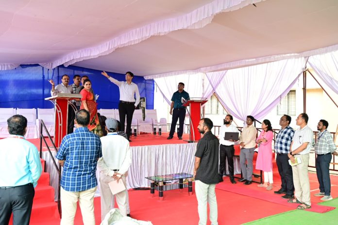 कार्यक्रमाच्या तयारीचा आढावा घेण्यासाठी जिल्हाधिकारी पंडा यांनी आज स्थलपरीक्षण केले. यावेळी कार्यक्रमासाठी करण्यात आलेल्या बैठकीच्या, मांडव व व्यासपीठाच्या व्यवस्थेची पाहणी करून कार्यक्रमाची सुसूत्रता आणि यशस्वी अंमलबजावणी सुनिश्चित करण्यासाठी संबंधित यंत्रणांना आवश्यक सूचना देण्यात आल्या.