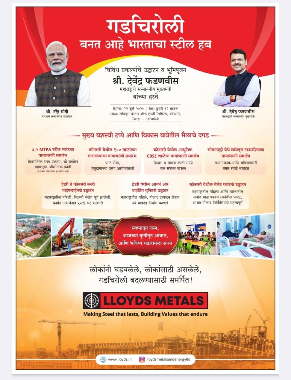मुख्यमंत्री फडणवीस गडचिरोली जिल्ह्यातील हेडरी येथे ५ दशलक्ष टन प्रतिवर्ष (एमटीपीए) लोहखनिज ग्राइंडिंग प्लांटचा पहिला टप्पा, हेडरी-कोनसरी १० एमटीपीए क्षमतेची स्लरी पाइपलाइन आणि कोनसरी येथे ४ एमटीपीए क्षमतेच्या पॅलेट प्रकल्पाचे उद्घाटन करतील. याशिवाय मंगळवारी दुपारी १२ वाजता होणाऱ्या या कार्यक्रमात ते ४.५ एमटीपीए क्षमतेच्या भव्य एकात्मिक पोलाद प्रकल्पाचे, १००-खाटांच्या रुग्णालयाचे, सीबीएसई पद्धतीच्या शाळेचे भूमिपूजन करतील. सोमनपल्ली येथील एलएमईएलच्या कर्मचारी वसाहतीचेसुद्धा ते भूमिपूजन करतील. गडचिरोली जिल्ह्याचे सहपालकमंत्री अ‍ॅड. आशीष जयस्वाल; आमदार धर्मरावबाबा आत्राम; आमदार डाॅ. मिलिंद नरोटे, एलएमईएलचे व्यवस्थापकीय संचालक बी. प्रभाकरन, गडचिरोली परिक्षेत्राचे उपमहानिरीक्षक अंकित गोयल; जिल्हाधिकारी अविश्यंत पंडा, माजी खासदार अशोक नेते, माजी आमदार डॉ. देवराव होळी, कोनसरीचे सरपंच श्रीकांत पावडे; पद्मश्री तुलसी मुंडा आणि इतर मान्यवर प्रामुख्याने उपस्थित राहतील. गडचिरोलीच्या औद्योगिक विकासात हा एक महत्त्वाचा टप्पा आहे. गेल्या काही वर्षांत, एलएमईएलने सुरजागड लोहखनिज खाणी आणि कोनसरी येथील डीआरआय तथा पेलेट प्रकल्प कार्यान्वयीत केल्यापासून स्थानिकांना मिळणाऱ्या रोजगारात लक्षणीय वाढ झाली आहे. रक्तरंजित हिंसेचा मार्ग सोडून शरणागती पत्करलेल्या माओवाद्यांनाही कंपनीने उद्योग-केंद्रित कौशल्यांचे प्रशिक्षण दिले आहे. त्यांना समाजाच्या मुख्य प्रवाहात आणण्याच्या प्रक्रियेला मदत करण्यासाठी त्यांना नोकऱ्यांमध्ये सामावून घेतले आहे. शिवाय या औद्योगिक क्रांतीने गडचिरोलीच्या विकासाला अभूतपूर्व चालना दिली आहे. श्री. बी. प्रभाकरन यांच्या मते, २२ जुलै २०२५ हा दिवस गडचिरोली तसेच महाराष्ट्राच्या इतिहासात सुवर्णाक्षरांनी नोंदवला जाणार आहे. गडचिरोली जिल्ह्यातील कोनसरी येथे विदर्भाच्या भव्य एकात्मिक पोलाद प्रकल्पाची पायाभरणी झाल्यामुळे गडचिरोलीला देशाचे स्टील हब बनवण्याचे ऐतिहासिक स्वप्न साकार करण्याच्या दिशेने एक पाऊल टाकले जात आहे. १४० वर्षांहून अधिक वर्षांपूर्वी गडचिरोली हे भारतीय स्टील उद्योगाचे जन्मस्थान होऊ शकले असते. ती वेळ आज आली आहे. आता खऱ्या अर्थाने गडचिरोलीच्या उदयाची वेळ आली आहे. लॉयड्स मेटल्स अँड एनर्जी लिमिटेडला येथील औद्योगिक क्रांतीचा ध्वजवाहक असल्याचा अभिमान आहे. सुरजागड येथील लोहखनिज खाणींचे यशस्वी हरित संचालन, कोनसरी येथील डीआरआय आणि पेलेट प्रकल्प कार्यान्वित झाल्यानंतर, आता एकात्मिक पोलाद प्रकल्पाच्या रूपात एक मोठी झेप घेतली जात आहे. गडचिरोलीला महाराष्ट्रतील पहिला जिल्हा बनवण्यास मदत केल्याबद्दल आम