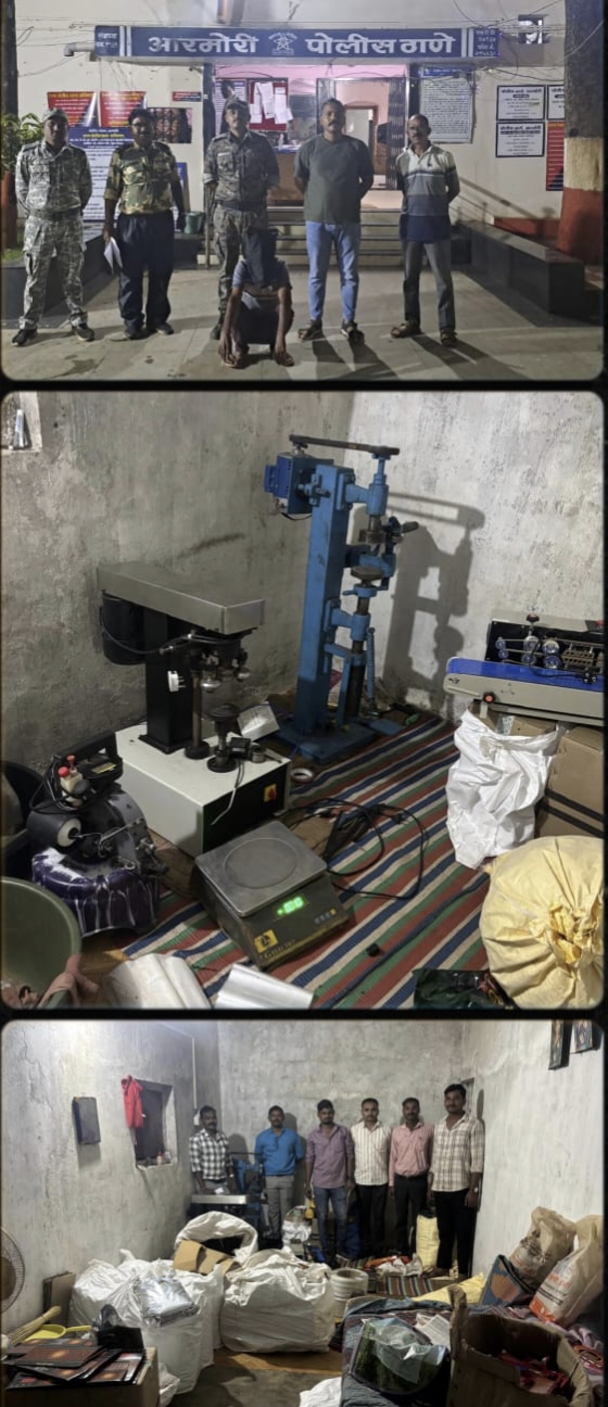 मंगळवार (ता. २) स्थानिक गुन्हे शाखेच्या पथकाला गोपनीय माहिती मिळाली की, १५ दिवसांपूर्वी मौजा डार्ली, ता. आरमोरी, जि. गडचिरोली येथील रेखाबाई सडमाके यांच्या राहते घरी आरोपी ओमप्रकाश गेडाम, रा. डार्ली, ता. आरमोरी, जि. गडचिरोली व इतर चार जणांनी मशिनच्या साहाय्याने सुगंधित तंबाखूचे उत्पादन करण्याकरिता अवैध कारखाना सुरू केला होता. अशी खात्रीशीर माहिती प्राप्त झाल्याने वरीष्ठांच्या मार्गदर्शनात स्थानिक गुन्हे शाखेचे एक पथक डार्ली येथे रवाना झाले. गोपनीय माहितीमध्ये नमूद महिला रेखाबाई सडमाके ( वय ४२) रा. डार्ली, ता. आरमोरी, जि. गडचिरोली हिच्या घरी पोहचून सर्व कायदेशीर प्रक्रियेस अनुसरून पोलिस पथकाने तिच्या घराची पंचासमक्ष झडती घेतली असता त्या घरामध्ये सुगंधित तंबाखूने भरलेल्या टिनाच्या डब्यांचे विविध बॉक्स व सुगंधित तंबाखूचे उत्पादन करण्याकरिता आवश्यक असणारे साहित्य आढळून आले. सर्व सुगंधित तंबाखू व साहित्य जप्त करण्यात आले. २ राखडी खर्ड्याच्या बॉक्समध्ये६५ नग मजा १०८ हुक्का शिश तंबाखू कंपनीचे भरलेले २०० ग्रॅम वजनाचे टिनाचे डब्बे, प्रति डब्बा अवैध विक्री किंमत २००० प्रमाणे एकूण १, ३०, ००० रुपये, मजा १०८ हुक्का – शिशा तंबाखू कंपनीचे १० खर्ड्याचे बॉक्स, प्रत्येक बॉक्समध्ये ५० ग्रॅम वजनाचे १० नग टिनाचे डब्बे, असे एकूण १०० नग टिनाचे डब्बे, अवैध विक्री किंमत ३०० रुपयेप्रमाणे एकूण किंमत ३०,००० रुपये. पांढऱ्या रंगाच्या चुंगळीमध्ये कच्चा तंबाखू असलेले २४ नग चुंगळी, प्रत्येक चुंगळीमध्ये ३ कि.ग्रॅ. वजनाचे ९६ प्लास्टिक असे एकूण २८८ कि.ग्रॅ. अवैध विक्री किंमत १००० रुपये प्रमाणे एकूण किंमत २,८८००० रुपये, निळ्या रंगाची २०० ग्रॅम वजनाचा मजा १०८ हुक्का शिशा तंबाखू पॅकींग करण्याची लोखंडी मशिन अंदाजे किंमत ८०, ००० रुपये ५० ग्रॅम वजनाचा मजा १०८ हुक्का शिशा तंबाखू टिनाचा डब्बा पॅकींग करण्याची इलेक्ट्रीक मोटर असलेली लोखंडी मशिन अंदाजे किंमत १,१०,००० रुपये, होला हुक्का शिशा तंबाखू प्लास्टिक पिशवी पॅकींग करण्याची लोखंडी मशीन अंदाजे किंमत ६५००० रुपये, हिमालया बॅग क्लोजर प्लास्टिक चुंगळी शिलाई मशीन अंदाजे किंमत ५०, ००० रुपये, इलेक्ट्रीक वजन काटा अंदाजे किंमत १५०० रुपये होला हुक्का शिशा तंबाखू पॅकींग करण्यासाठी वापरलेली फिलीप्स कंपनीची हेअर स्ट्रेटनर २ नग, प्रत्येकी किंमत २००० रुपये प्रमाणे एकूण ४००० रुपये, इतर रिकामे टिनाचे डब्बे, टिनाच्या डब्याला सिल करण्याकरिता वापरला जाणारा सील, टिनाचे गोल झाकण, प्लास्टिक टेप (चिकटपट्टी), पांढऱ्या रंगाच्या नायलॉनच्या पट्ट्या, कागदी खर्ड्याचे बॉक्स, प्लास्टिक, हिरव्या रंगाची प्लास्टिक पिशवी, प्लास्टिक पाऊच, स्टिकर्स आदी साहित्