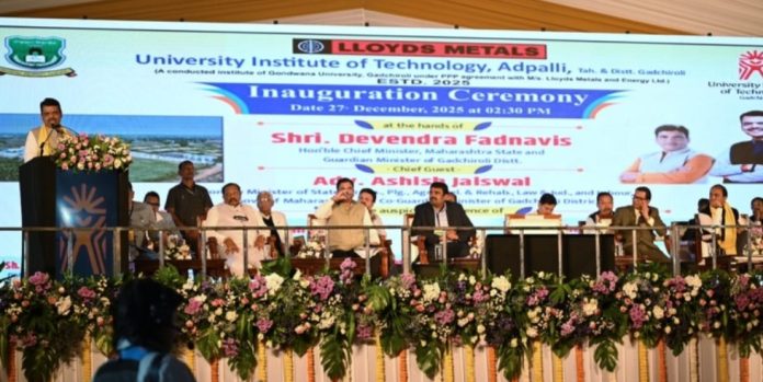 गडचिरोली जिल्ह्यात तंत्रकौशल्य शिक्षणाला चालना देण्यासाठी गोंडवाना विद्यापीठ व लॉयड्स मेटल्स ॲण्ड एनर्जी लिमिटेड यांच्या सार्वजनिक–खासगी भागीदारीत अडपल्ली (गडचिरोली) येथे स्थापन झालेल्या विद्यापीठ तंत्रज्ञान संस्था (UATI) चे उद्घाटन मुख्यमंत्री देवेंद्र फडणवीस यांच्या हस्ते शनिवार (ता. २७) करण्यात आले. या कार्यक्रमाला वित्त, नियोजन, कृषी, मदत व पुनर्वसन, विधी व न्याय, कामगार राज्यमंत्री तथा गडचिरोली जिल्ह्याचे सहपालकमंत्री अॅड. आशीष जयस्वाल, गृह (ग्रामीण), गृहनिर्माण, शालेय शिक्षण, सहकार, खनिकर्म राज्यमंत्री डाॅ. पंकज भोयर, आमदार धर्मरावबाबा आत्राम, आमदार डॉ. मिलिंद नरोटे, गोंडवाना विद्यापीठाचे कुलगुरू डॉ. प्रशांत बोकारे, लॉयड्स मेटल्स अ‍ॅण्ड एनर्जी लिमिटेडचे व्यवस्थापकीय संचालक बालसुब्रमण्यम प्रभाकरन, जिल्हाधिकारी अविश्यांत पंडा, जिल्हा पोलीस अधीक्षक नीलोत्पल यांची प्रमुख उपस्थिती होती. पुढे मार्गदर्शन करताना मुख्यमंत्री देवेंद्र फडणवीस म्हणाले की, आम्ही जिल्ह्यात रोजगार निर्मितीसाठी खाणीला परवानगी दिली. या परिवर्तनात कंपनीचे बी. प्रभाकरन यांचे योगदान महत्त्वाचे आहे. आम्ही गडचिरोलीला केवळ स्टिल हब नाही, तर ग्रीन स्टील हब करू. जल, जंगल, जमिनीचे रक्षण करून. जिल्ह्यात पाच कोटी वृक्ष लावणार आहोत. त्यापैकी ४० लाख वृक्षारोपण झाले आहेत. शिवाय जिल्ह्यात विमानतळासाठी तीन जागांचे प्रस्ताव आले आहेत. त्यापैकी एक जागा निश्चित करून जिल्ह्यात विमानतळही लवकरच तयार होईल. तसेच गडचिरोलीला गेट वे आॅफ साऊथ इंडिया बनवणार, असेही ते म्हणाले. प्रास्ताविकात विद्यापीठाचे कुलगुरू डाॅ. प्रशांत बोकारे यांनी सहकार्याबद्दल मुख्यमंत्री देवेंद्र फडणवीस, कंपनीचे व्यवस्थापकीय संचालक प्रभाकरन यांचे आभार मानले. कार्यक्रमात दुबई येथे पार पडलेल्या एशियन युथ पॅरा गेम्समध्ये पॅरा आर्चरी स्पर्धेत सुवर्ण व कांस्य पदक पटकावणारी गडचिरोली जिल्ह्याची दिव्यांग खेळाडू श्वेता कोवे हिचा सत्कार करण्यात आला. गडचिरोली पोलिसांना ३४ वाहनांचा ताफा उपलब्ध करून देण्यात आला. गडचिरोली पोलिस विभागाच्या वाढीव विश्रामगृहाचे भूमिपूजनही मुख्यमंत्री देवेंद्र फडणवीस यांच्या हस्ते करण्यात आले. यावेळी वित्त, नियोजन, कृषी, मदत व पुनर्वसन, विधी व न्याय, कामगार राज्यमंत्री तथा गडचिरोलीचे सहपालकमंत्री अॅड. आशीष जयस्वाल, गृह (ग्रामीण), गृहनिर्माण, शालेय शिक्षण, सहकार, खनिकर्म राज्यमंत्री डाॅ. पंकज भोयर, आमदार डॉ. मिलिंद नरोटे नक्षलविरोधी अभियानाचे विशेष पोलिस महानिरीक्षक संदीप पाटील, पोलिस उपमहानिरीक्षक अंकीत गोयल, जिल्हाधिकारी अविश्यांत पंडा, जिल्हा पोलिस अधीक्षक नीलोत्पल उपस्थित होते.