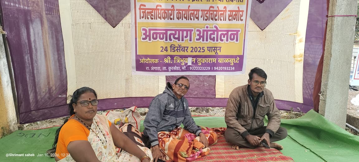 गडचिरोली, ता.११ : मौजा अंगारा, तालुका कुरखेडा येथील शेती फेरफार प्रकरणात गेल्या दहा वर्षांपासून न्याय न मिळाल्याच्या निषेधार्थ त्रिभुवन तुकाराम बाळबुद्धे (रा. अंगारा, ता. कुरखेडा) यांनी जिल्हाधिकारी कार्यालय, गडचिरोली समोर अन्नत्याग आंदोलन सुरू केले आहे.