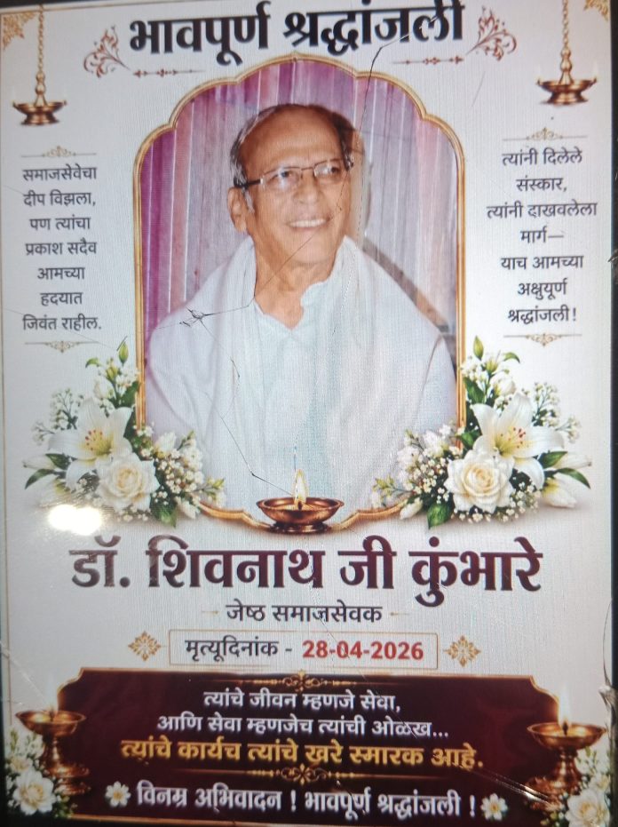 गडचिरोली, ता.२८ : राष्ट्रसंत तुकडोजी महाराजांच्या विचारांचे काटेकोर अनुसरण करताना त्यांच्या विचारांचा आजीवन प्रसार करणारे ज्येष्ठ समाजसेवक, विविध सामाजिक, धार्मिक व सांस्कृतिक संस्थांचे मार्गदर्शक डॉ. शिवनाथ कुंभारे यांचे मंगळवार (ता. २८) दुपारी ११ वाजता गडचिरोली येथील निवासस्थानी वृद्धापकाळाने दुःखद निधन झाले. मृत्यूसमयी ते ७९ वर्षांचे होते. त्यांच्या निधनामुळे गडचिरोली जिल्ह्यात शोककळा पसरली आहे.